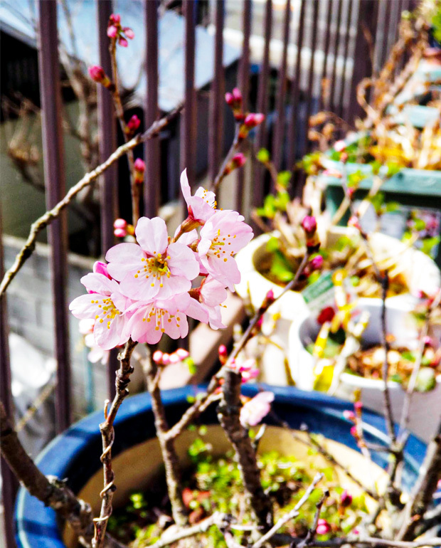 横浜市内の民間の皆様が深く交流している米沢市から8年ほど前に頂いた山形県特産の“啓翁桜”が、つぼみから開花を迎えました。