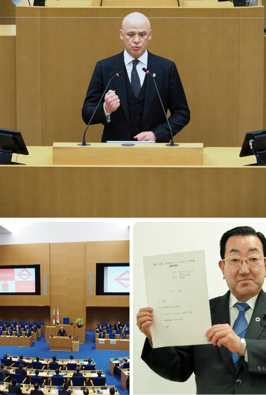 姉妹都市であるウクライナのオデーサ市からゲネディー・トゥルハノフ市長が来浜し、本会議場で演説を行いました。