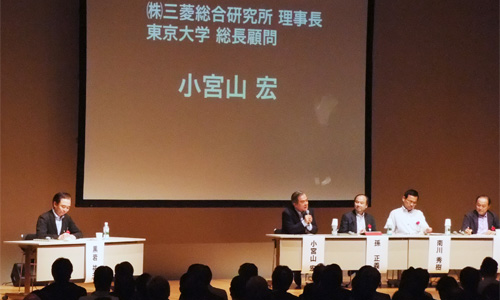 午前中のセッションでは黒岩神奈川県知事をコーディネーターとして、小宮山(株)三菱総合研究所理事長、孫ソフトバンク(株)社長、南川環境事務次官、山崎太陽経済の会代表理事がそれぞれの意見を出し合い、最後に太陽光などの再生エネルギーによる経済社会の構築に向けて決意が示されました。
