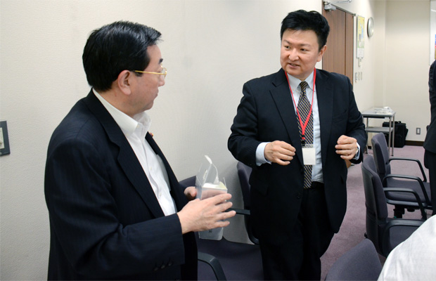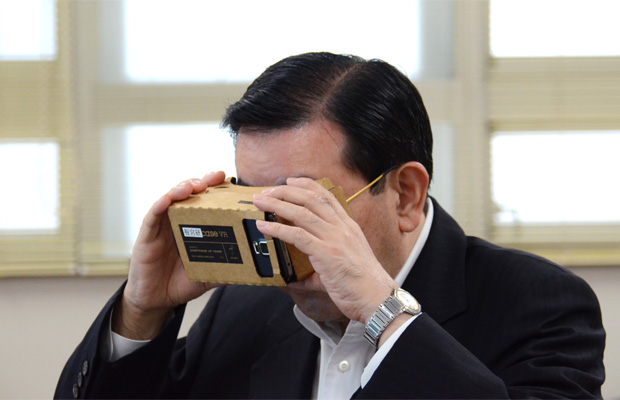 スマートフォンと簡易ゴーグルを活用して、いつでも、どこでもバーチャル避難訓練が可能となるアプリを開発した愛知工科大学の板宮朋基准教授と意見交換しました。