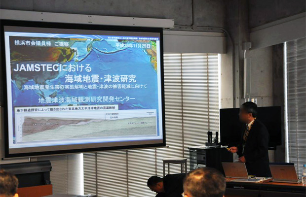 「海洋、地球、生命をキーワードとして、世界最先端の研究と技術開発を推進」する同研究所の、地震・津波観測監視システム(DONET)、地球シミュレータ(スーパーコンピューター)などを視察しました。
