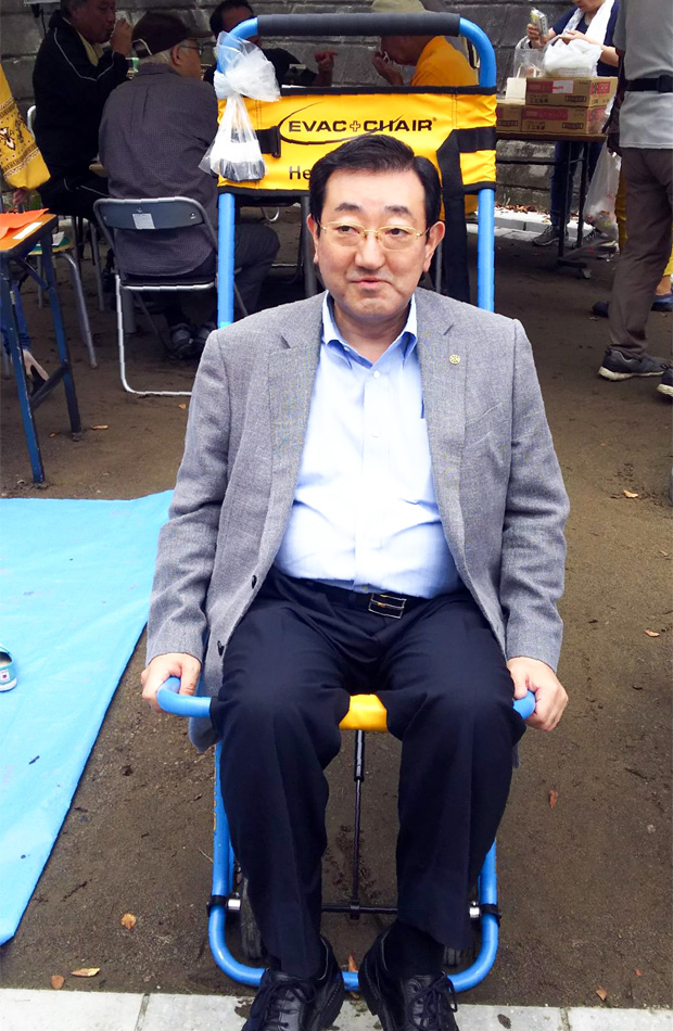 大規模高層団地のフェスティバルでは、防災機器の紹介コーナーで階段を降りられる車イスに出会いました。