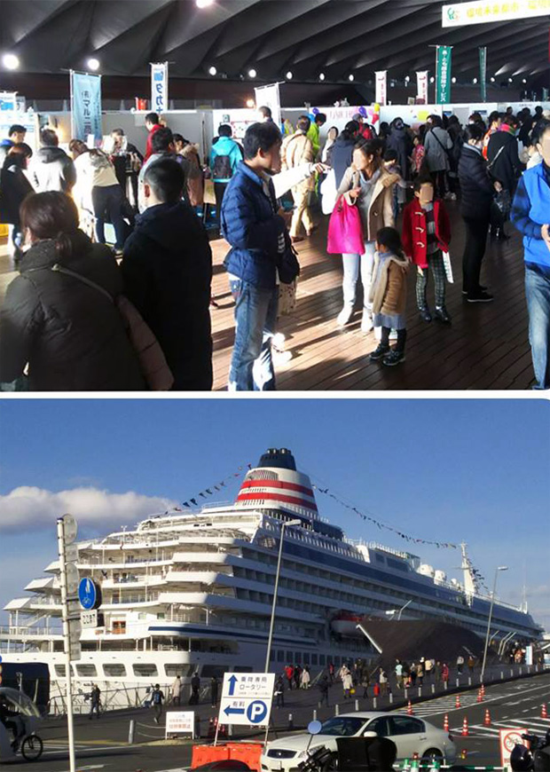 豪華客船「飛鳥U」が着岸している横浜港大さん橋国際客船ターミナルのホールで、「環境未来都市・環境絵日記展2017」が開催されました。