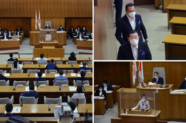 新型コロナウイルス感染防止対策として、演壇と議長席にアクリル製パネルが設置され、議場へは議員が2班に分かれて交代で出席しました。