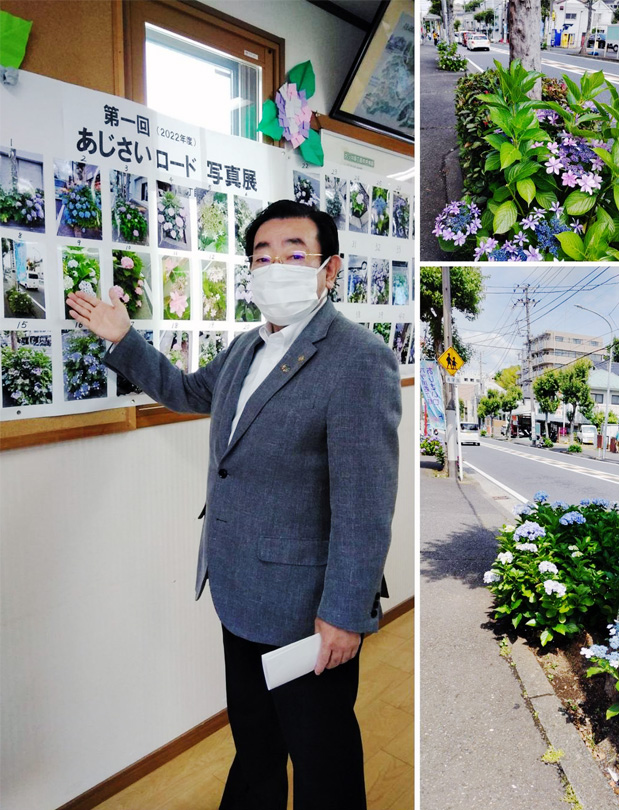 地元町内会では、長寿クラブを中心とした有志の皆様が、幹線道路沿いを“あじさい”で彩る「あじさいロード」への取組を行っています。