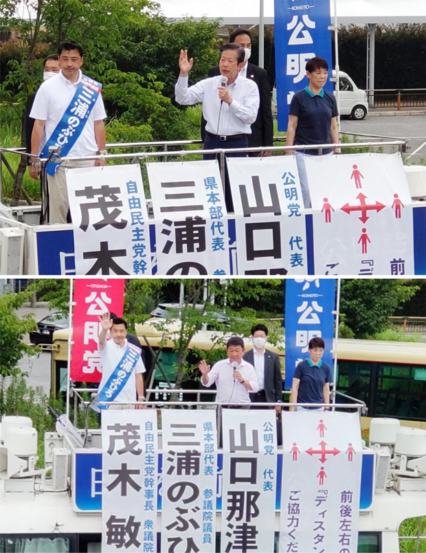 参院選挙が後半の3日目を迎え開催された三浦のぶひろ候補の街頭演説会に、自民党の茂木?充幹事長、公明党の山口那津男代表が次々と応援に駆けつけ、「自公で日本の未来を拓く!」と訴えました。