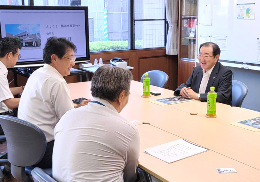 このほど、高校調査の一環として市立横浜商業高校を訪問し、大山校長先生らと意見交換しました。 明治15年に横浜商法学校として設立され、昭和23年に新学制に伴い市立横浜商業高校と改称されました。 “Y校“として親しまれていますが、校舎も上空から見るとYの字です。