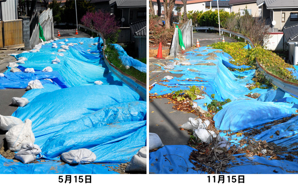 仙台市内は、市外から復旧に携わる方々の流入もあるとのことで、人の移動が目立ちました。一方で、この5月に公明党横浜市会議員団が被害状況を調査した道路にはブルーシートが被されたままとなっているなど、復旧も捗っていない状況も確認されました。