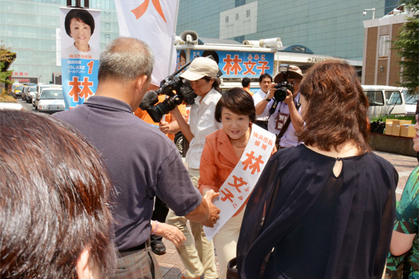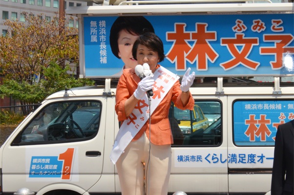 林文子候補は、保育所待機児童ゼロなど4年間の実績を訴え、公約として掲げる「10の実現」への決意を示しました。