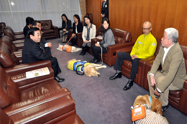 その後、各協会の代表や利用者の皆様と補助犬が市会議長へ表敬訪問しました。副議長として私も同席し、これからの普及啓発活動などについて、意見交換しました。