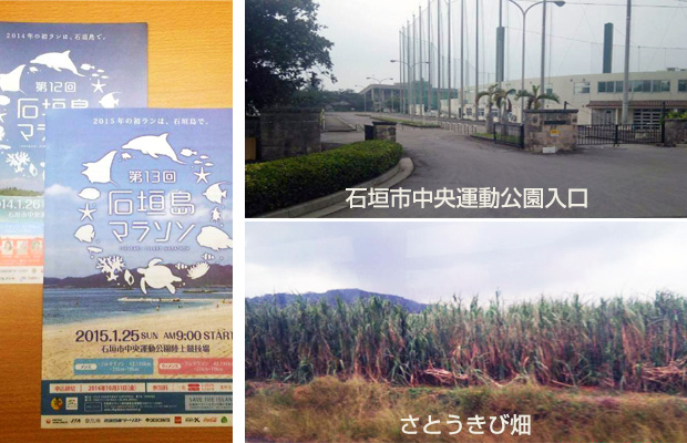 「初ランは、石垣島で」とアピールするマラソンには全都道府県からの参加があり、毎年500人の参加者増とのこと。石垣市中央運動公園陸上競技場をスタートし、さとうきび畑や海を臨みながらの42.195kmのコースを走りました。バスで!