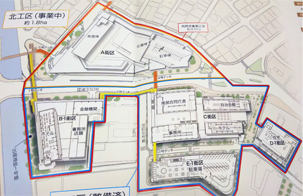 既に約2.7haの南工区は平成24年に整備を終え、北工区が事業中。事務所・公共公益施設・商業施設等を複合させ、バスターミナルを活かした交通結節点の形成を図るとしている。