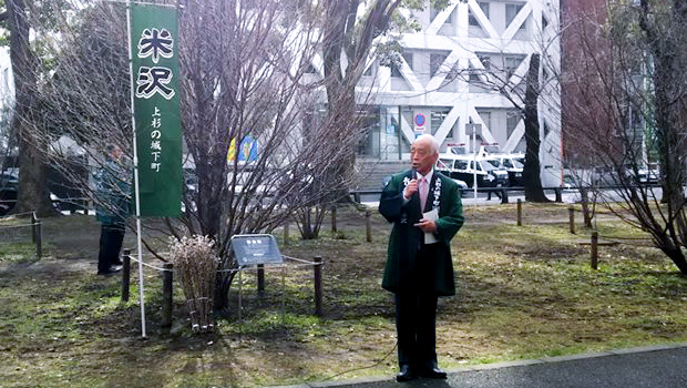 米沢市から寄贈された啓翁桜が植樹されている横浜市の大通り公園でのセレモニーでは、主催者である中川勝米沢市長から挨拶があり、最後に参加者で記念撮影しました。
