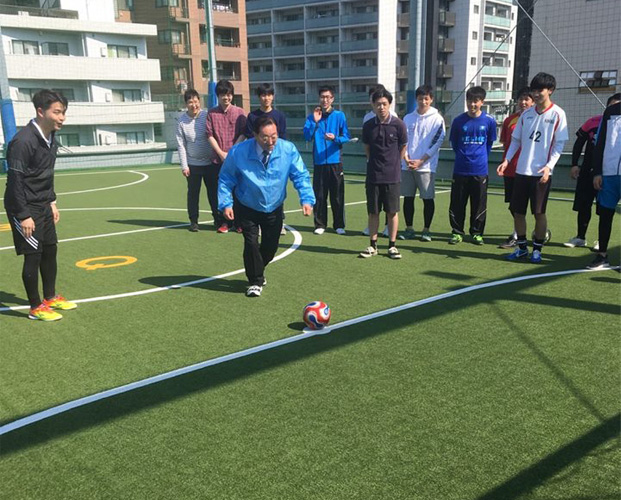 今朝は、若者が集まったフットサル会場での始球式のひと蹴りから始動。