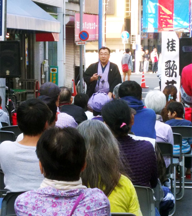 先週末に行われた横浜運河パレードの三吉橋会場では、商店街の屋外で落語を楽しんでいました。