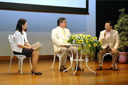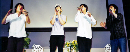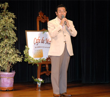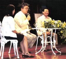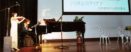 タイトルはCafe de Minami(カフェ デ ミナミ)。公会堂のステージがカフェになり、一流の歌声や音楽や映像が醸し出す素晴らしい空間で、教育に関する語らいが行われました。