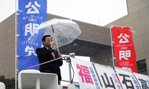 雪の降る2月11日、公明党の山口代表が横浜市中区で街頭演説を行い、統一地方選完勝に向け全国遊説をスタートさせました。仁田まさとし市議が司会を務め、演説会の開会にあたり、4月の統一地方選は、地域を変え、そして日本を変える担い手を選ぶ重要な選挙であることを強調しました。山口代表のほか、石井党政調会長、高木党選対委員長、地元中区選出の福島直子横浜市議が挨拶に立ちました。